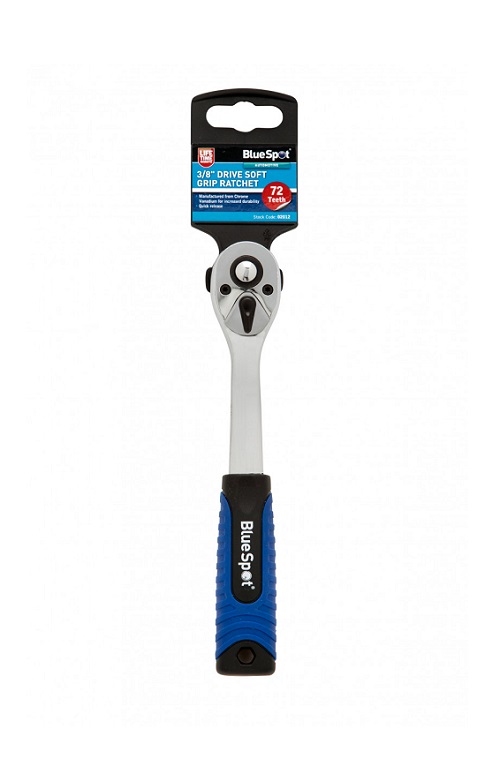 Blue Spot 3/8″ Soft Grip Ratchet. Soft contour grip handle for comfort and grip. Manufactured from Chrome Vanadium. Quick release. 72 teeth ratchet mechanism.