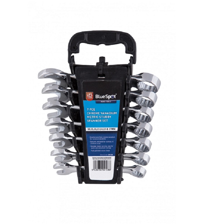 The BlueSpot 7 Piece Stubby Spanner Set is specially designed for working in confined spaces. Manufactured from chrome vanadium, heat-treated and nickel-plated for increased durability. Includes useful carrying case for quick and convenient storage. Sizes: 10, 11, 12, 13, 14, 15 & 17mm.
