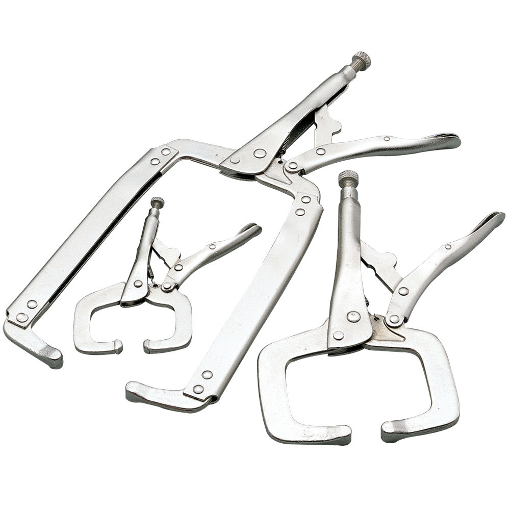 A set of 3 different sized clamps for holding metal securely in position prior to welding. Popular C configuration. Use additional sets for larger structures. Professional quality. Throat sizes 6″, 11″ & 18″. Adjustable tension. Quick release. Helps ensure the jobs well done.