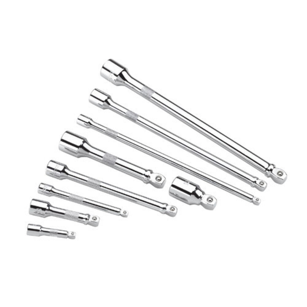 Set of 9 Chrome Vanadium Wobble Extension Bars for 1/4″, 3/8″ & 1/2″ Square Drive Sockets, Knurled section for improved grip when fingers are oily. Sockets can be driven with shaft offset by up to 10 degrees. 1/4″: (50, 100 & 225mm). 3/8″: (75, 150 & 225mm). 1/2″: (50, 125 & 225mm).