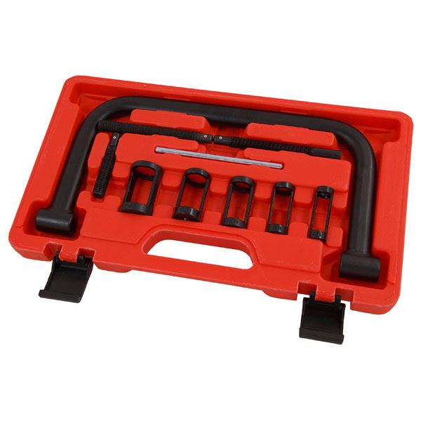 This 5 In 1 valve spring compressor kit enables you to fit valve springs correctly and allows safe and easy compresion, suitable for smaller engines and motorcycles. The Kit Includes: 1 X Spring compressor C-Clamp. 5 X open sided adaptors: f 16mm, 19mm, 23mm, 25mm & 30mm. 3 X extension screws: 70mm, 110mm and 120mm length. 1 X compression bar. 1 X telescopic magnetic pick. 1 X tweezers. Ideal for Cars, Vans, Motorcycles and small Bore Engines.