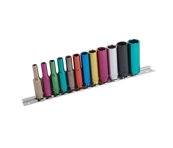 Neilsen CT0906 12 Piece 1/4″ Dr – Multi-coloured Sockets. Sizes – 4, 4.5, 5, 5.5, 6, 7, 8, 9, 10, 11, 12 & 13mm. Supplied with a Handy socket rail.