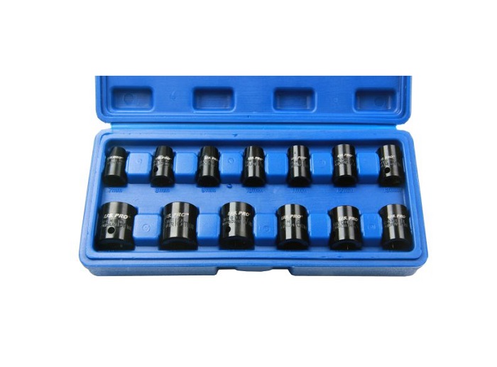 US Pro 13PC 3/8″ Dr Shallow Impact Sockets – Metric. Sizes: 7, 8, 9, 10, 11, 12, 13, 14, 15, 16, 17, 18, & 19mm. 6 Point. CR-V. Rust resistant phosphate finish.