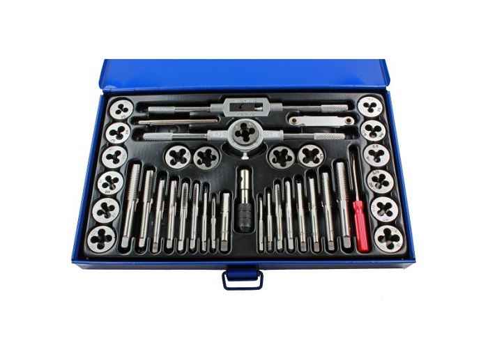 US Pro 40Pc Metric Tap And Die Set. Contents: 17 Taps & 17 Dies in the following sizes: 3 × 0.5, 3 × 0.6, 4 × 0.7, 4 × 0.75, 5 × 0.8, 5 × 0.9, 6 × 0.75, 6 × 1.0, 7 × 0.75, 7 × 1.0, 8 × 1.0, 8 × 1.25, 10 × 1.25, 10 × 1.5, 12 × 1.5, 12 × 1.75, 1/8 – 27. 1 x Die Handle. 1 x Tap Wrench. 1 x T-Type Tap Wrench. 1 x Screw-Pitch Gauge. 1 x Screwdriver. 1 x Metal Case.
