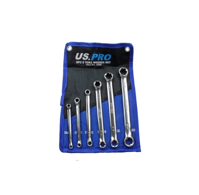 US Pro 6PC E TORX Wrench Set. A quality set of 6 highly polishd E Torx wrenches. Sizes: E6 x E8, E7 x E11, E10 x E12, E14 x E18, E16 x E22 and E20 x E24. CRV. Supplied in a Canvas storage pouch.